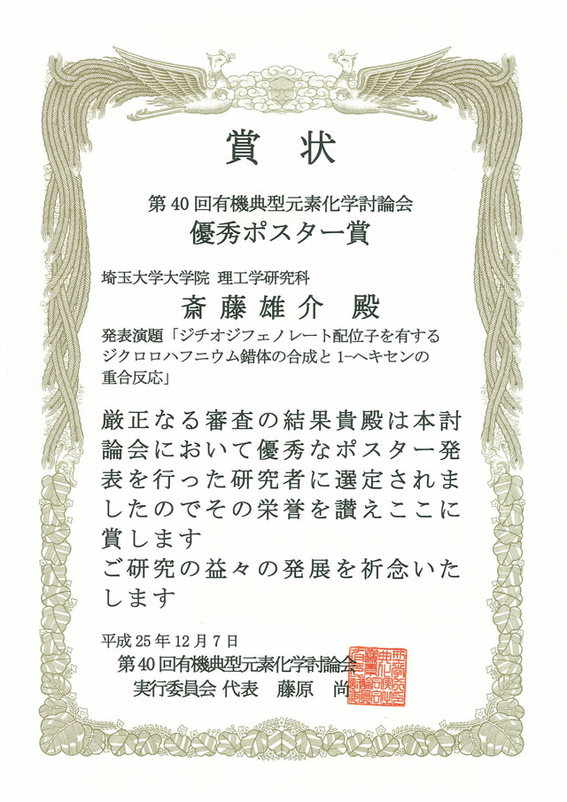 - 石井研究室の斎藤雄介君(博士後期課程1年)が,第40回有機典型元素化学討論会で優秀ポスター賞を受賞しました。おめでとうございます。