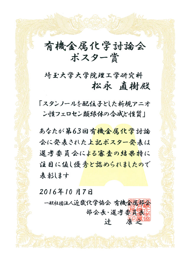 - 斎藤雅一研究室の松永直樹君(博士前期課程2年)が,第63回有機金属化学討論会でポスター賞を受賞しました。おめでとうございます。