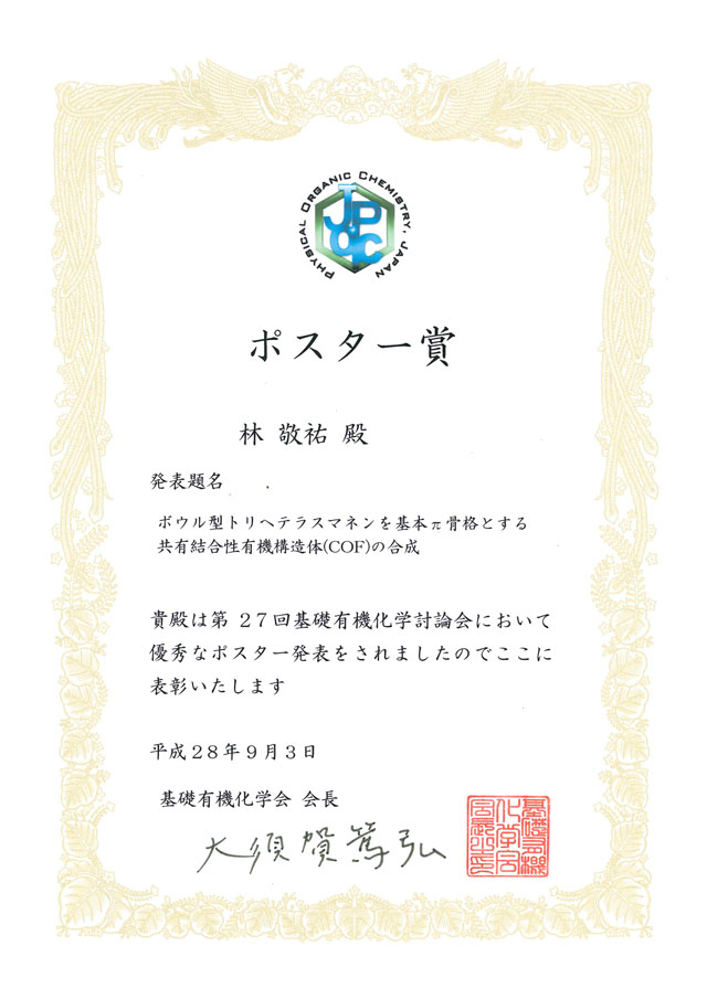 - 斎藤雅一研究室の林敬祐君(博士前期課程1年)が,第27回基礎有機化学討論会でポスター賞を受賞しました。おめでとうございます。