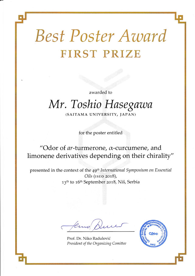 - 長谷川登志夫准教授が,セルビヤのニシュで開催された第49回国際精油シンポジウムISEOにて,最優秀ポスター賞を受賞しました。おめでとうございます。