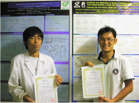 ● 第44回有機反応若手の会が,7月9日から11日,石井研究室の世話で埼玉県立スポーツ研修センター(上尾)で開催されました。全国の大学から130余名が参加し,特別講演(5件),一般講演,ポスター発表が行われました。ポスター発表では,参加研究室と特別講演者の投票により8名にポスター賞が授与され,本学からは金冨芳彦君(M1, 斎藤(雅)研究室)と戸田智之君(M2, 石井研究室)が受賞しました。