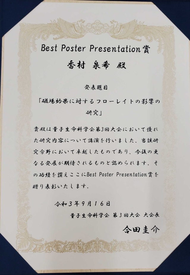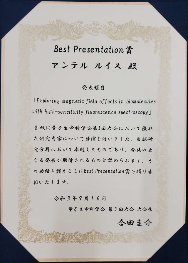 - 9月16日に東京大学主催で行われた第3回量子生命科学会において、量子生物物理化学(前田)研究室の以下の両名がそれぞれ授賞されました。おめでとうございます。
