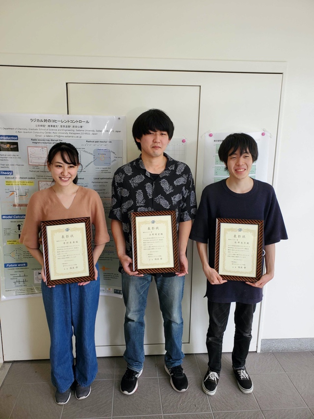 - 量子生物物理化学(前田)研究室の立野明宏君(博士前期課程2年)、香村泉希さん(博士前期課程1年)、佐野永昂君(博士前期課程1年)が、令和3年8月22-27日にオンライン開催された国際会議ISMAR-APNMR-NMRSJ-SEST 2021において、SEST Poster Awardsを受賞しました。