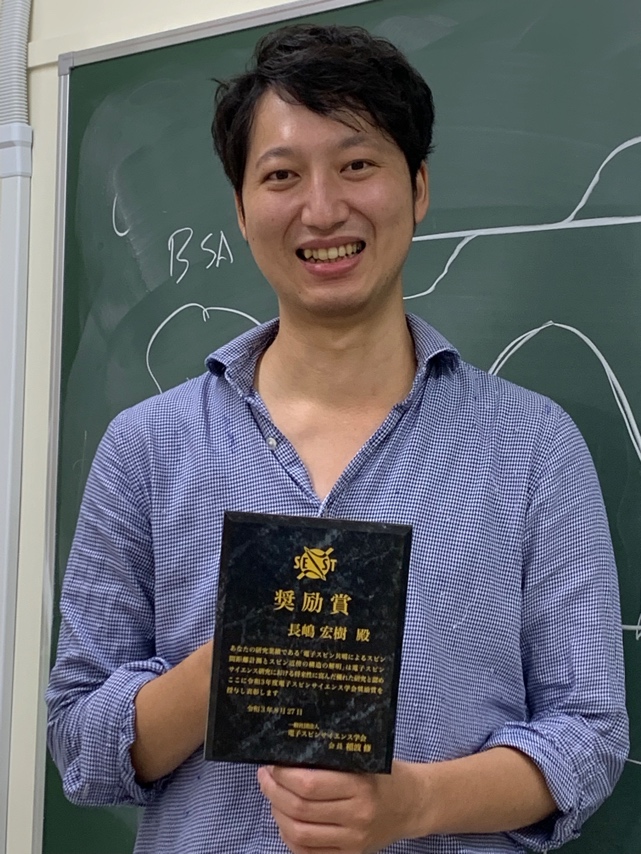 - 量子生物物理化学(前田)研究室の長嶋宏樹助教が、「令和3年度・電子スピンサイエンス学会(SEST)奨励賞」を受賞しました。本賞は学会会員にして、電子スピンサイエンスに関する研究成果が優れ、将来性が十分期待される40歳未満の若手研究者に贈られるもので、本年は2名の若手研究者が受賞しました。