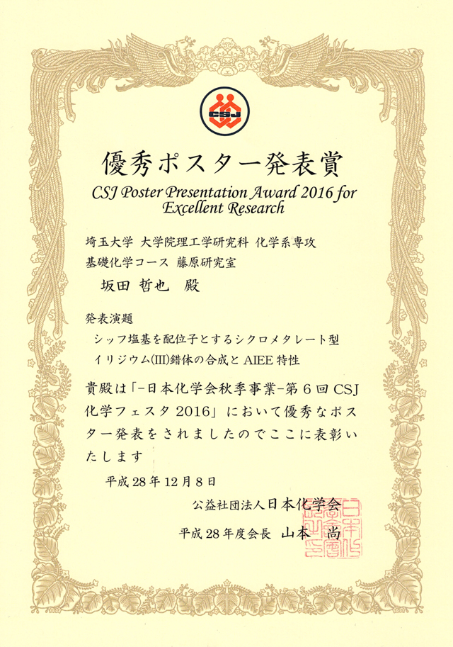 - 藤原研究室の坂田哲也君(博士前期課程1年)が,第6回CSJ化学フェスタ2016でポスター賞を受賞しました。おめでとうございます。