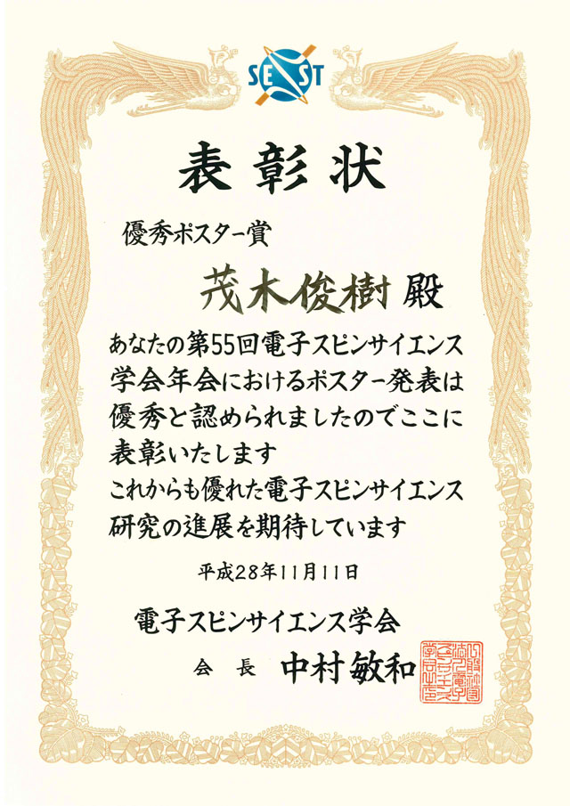 - 前田研究室の茂木俊樹君(博士前期課程2年)が,第55回電子スピンサイエンス学会年会において優秀ポスター賞を受賞しました。おめでとうございます。