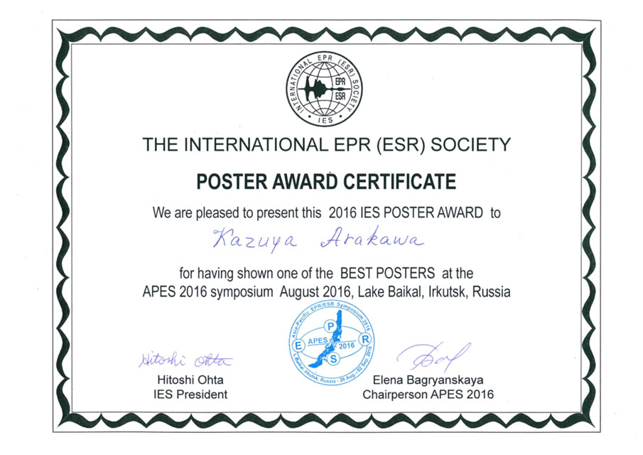 - 前田研究室の荒川和也君(博士前期課程2年)が,8月28日から9月4日にかけて行われた国際会議,Asia Pacific EPR/ESR Symposium 2016において,International EPR Societyポスター賞を受賞しました。本ポスター賞はローカルな学会組織によるものではなく,国際組織International EPR(ESR) Society (国際EPR学会)から授与されるものです。おめでとうございます。