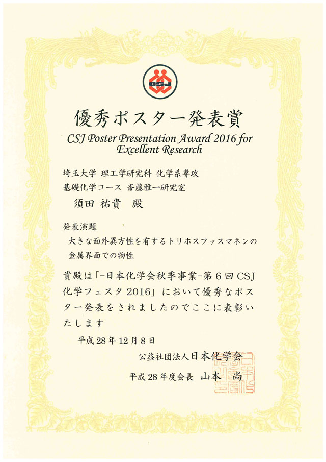 - 斎藤雅一研究室の須田祐貴君(博士前期課程2年)が,第6回CSJ化学フェスタ2016でポスター賞を受賞しました。おめでとうございます。