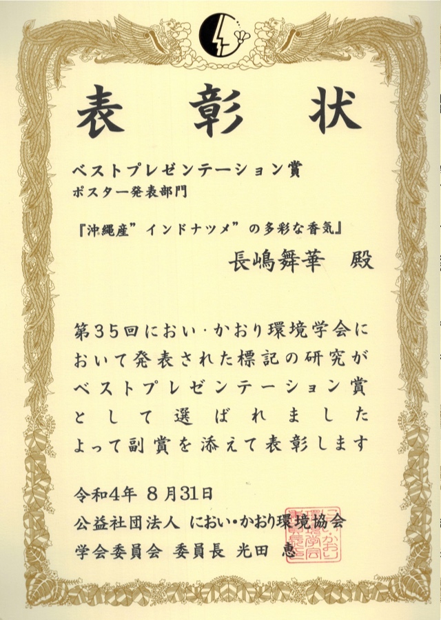 - 8月30日に大同大学で行われた第35回におい・かおり環境学会において、藤原研究室の長嶋舞華さん(博士前期課程1年)がベストプレゼンテーション賞を授賞されました。おめでとうございます。