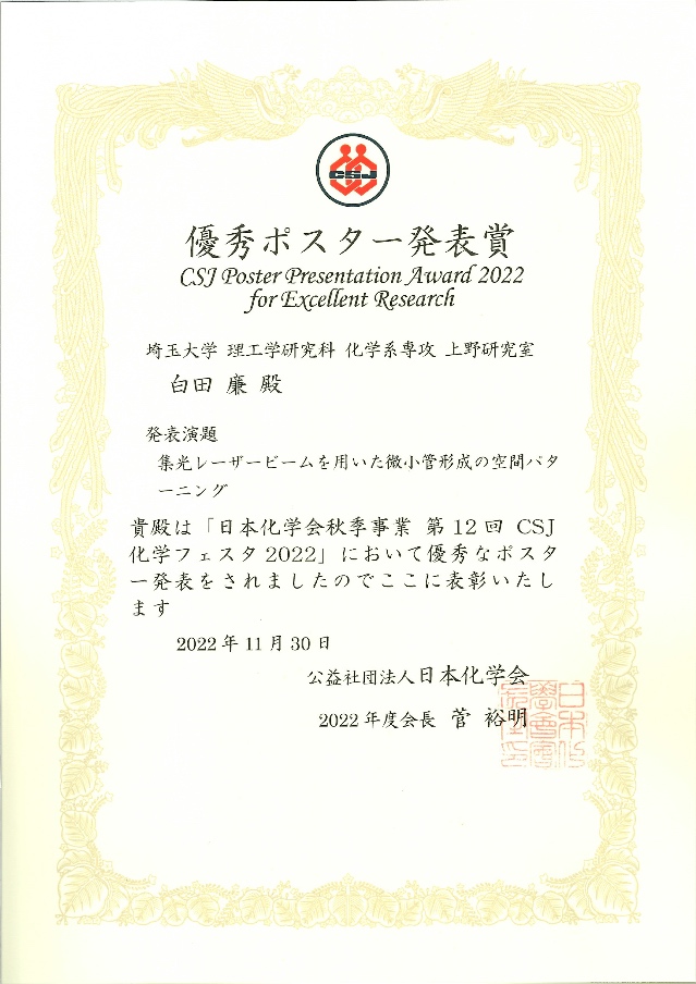 - 2022年10月18日〜20日にタワーホール船橋で開催された第12回CSJ化学フェスタ2022において、博士前期課程2年の白田簾さん(上野研究室所属、研究指導は大阪大学・吉川洋史教授)が優秀ポスター発表賞を受賞しました。おめでとうございます。