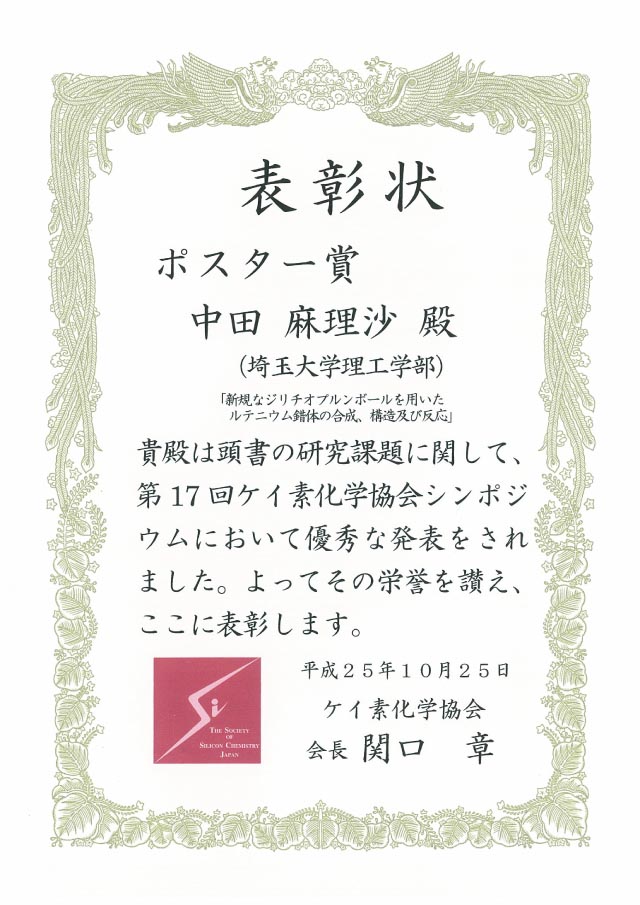 - 斎藤雅一研究室の中田麻里沙さんが,第17回ケイ素化学協会シンポジウムでポスター賞を受賞しました。おめでとうございます。