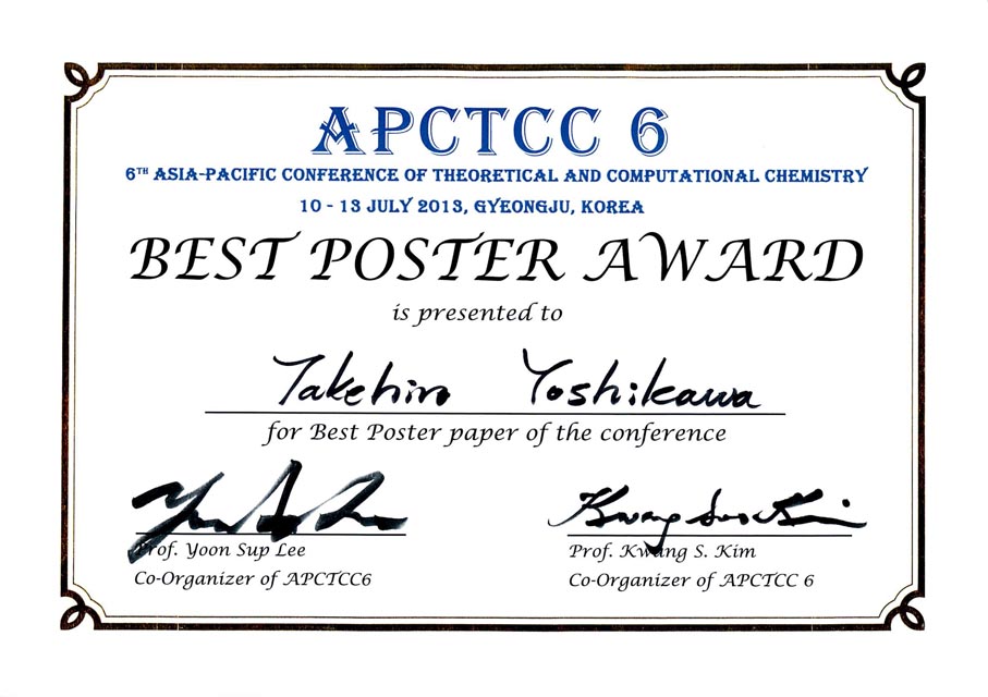 - 高柳研究室の吉川武宏君が,Sixth Asia-Pacific Conference of Theoretical and Computational Chemistry (APCTCC6)で優秀ポスター賞を受賞しました。おめでとうございます。