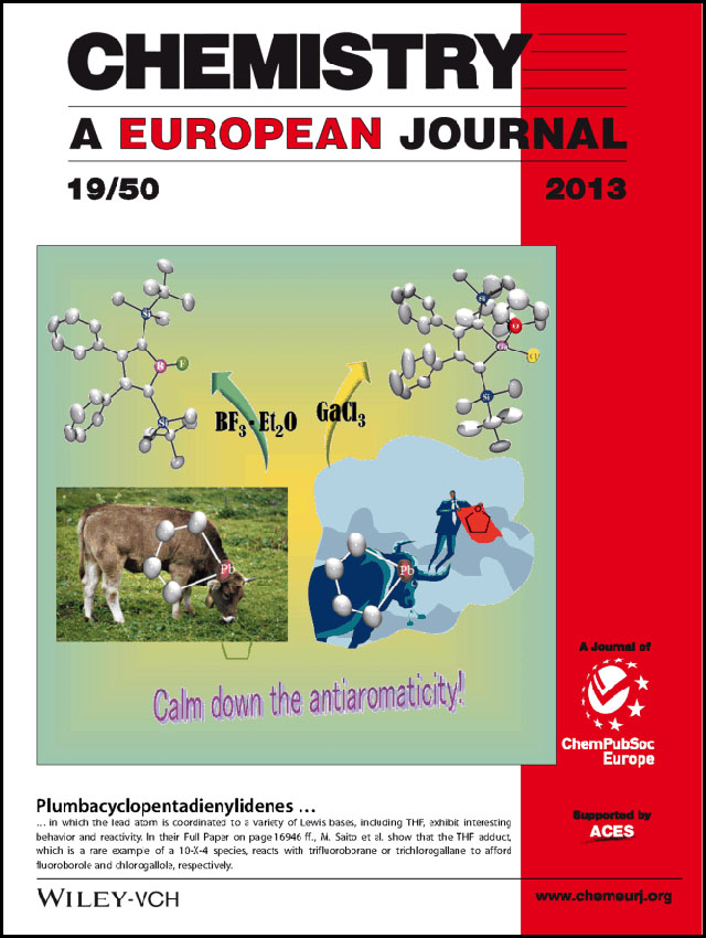 - 斎藤教授らの研究グループが鉛を骨格に含む反芳香族化合物の安定化に成功し、その論文がChemistry - A European Journal誌のback coverに選出されました。