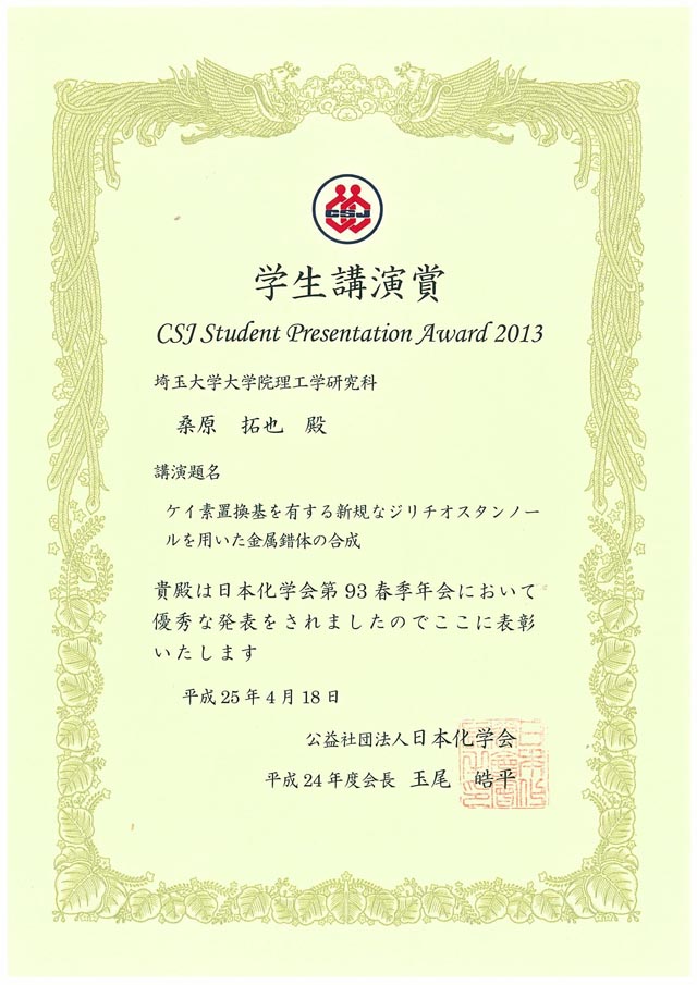 - 斎藤雅一研究室の桑原拓也君が,日本化学会第93春季年会で学生講演賞を受賞しました。おめでとうございます。