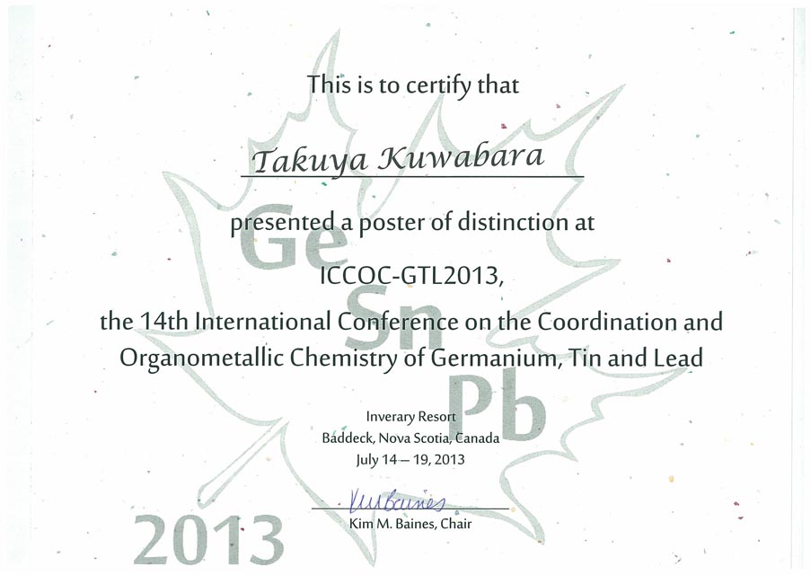- 斎藤雅一研究室の桑原拓也君が,14th International Conference on the Coordination and Organometallic Chemistry of Germanium Tin and Lead, Baddeck (Canada)で優秀ポスター賞を受賞しました。おめでとうございます。