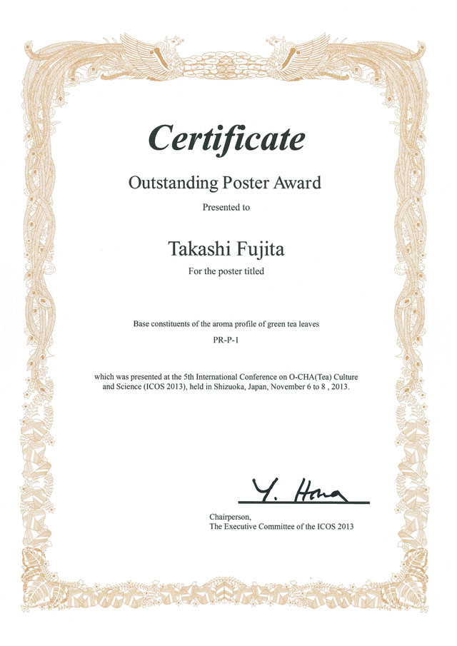 - 長谷川研究室の藤田隆君が,5th international conference on O-Cha (Tea) culture and science (ICOS2013)でoutstanding poster awardを受賞しました。おめでとうございます。