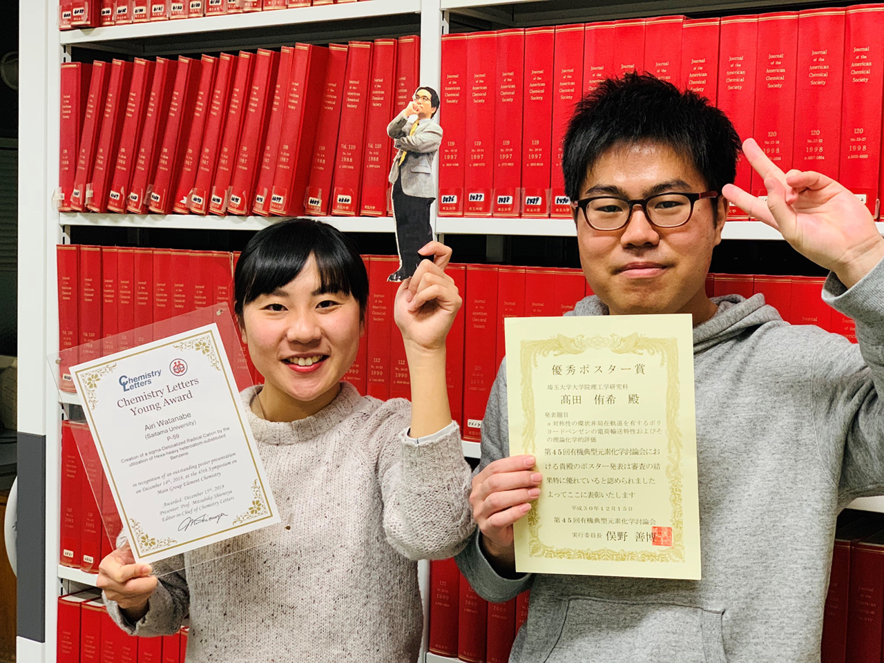 - 斎藤雅一研究室の渡辺愛理さん(博士前期課程1年)が,第45回有機典型元素化学討論会で優秀ポスター賞およびChemistry Letters Young Awardを,髙田侑希君(博士前期課程1年)が,優秀ポスター賞を受賞しました。おめでとうございます。