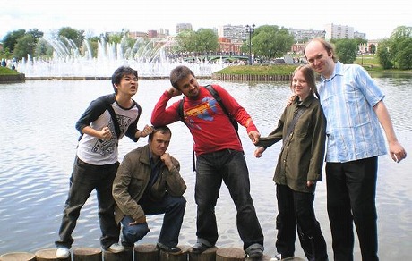| モスクワ大学の大学院生と交流している吉村泰範君(一番左)です。 |