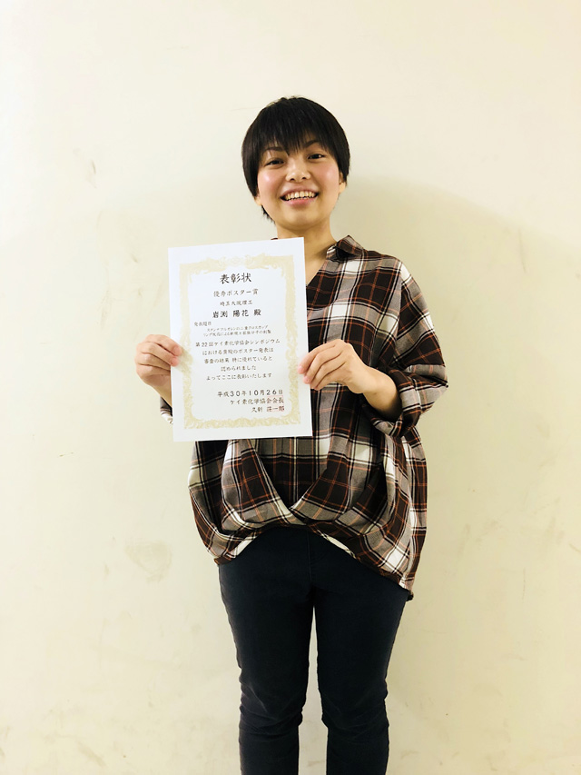 - 斎藤雅一研究室の岩渕陽花さん(博士前期課程1年)が,第22回ケイ素化学協会シンポジウムでポスター賞を受賞しました。おめでとうございます。