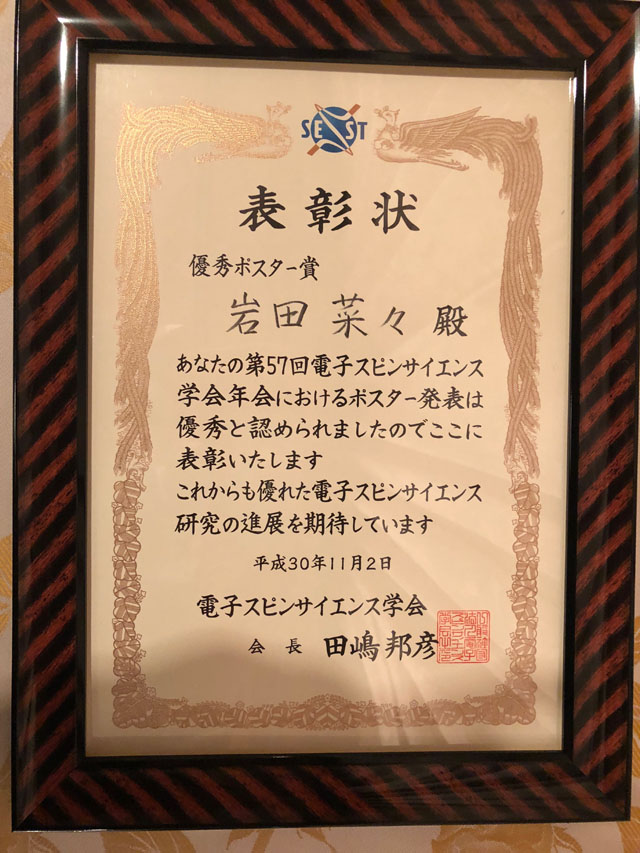 - 前田研究室の岩田菜々さん(博士前期課程1年)が,第57回電子スピンサイエンス学会年会において優秀ポスター賞を受賞しました。おめでとうございます。